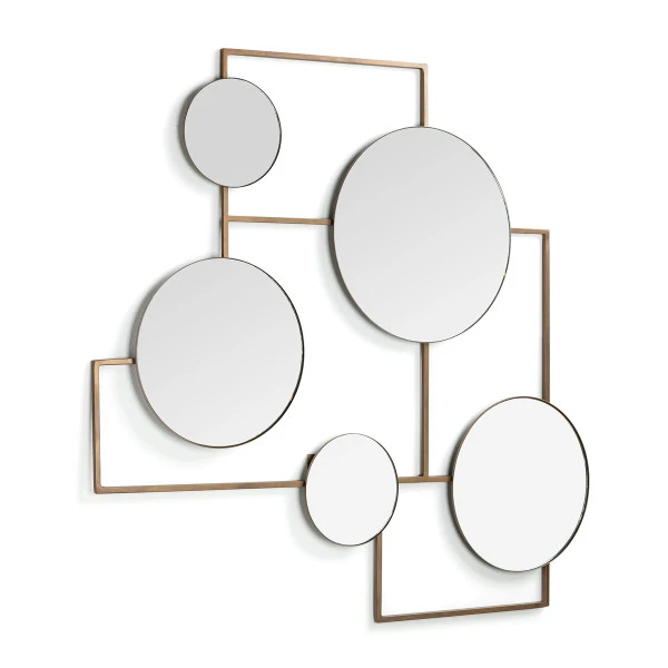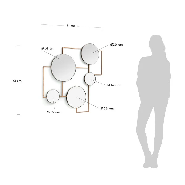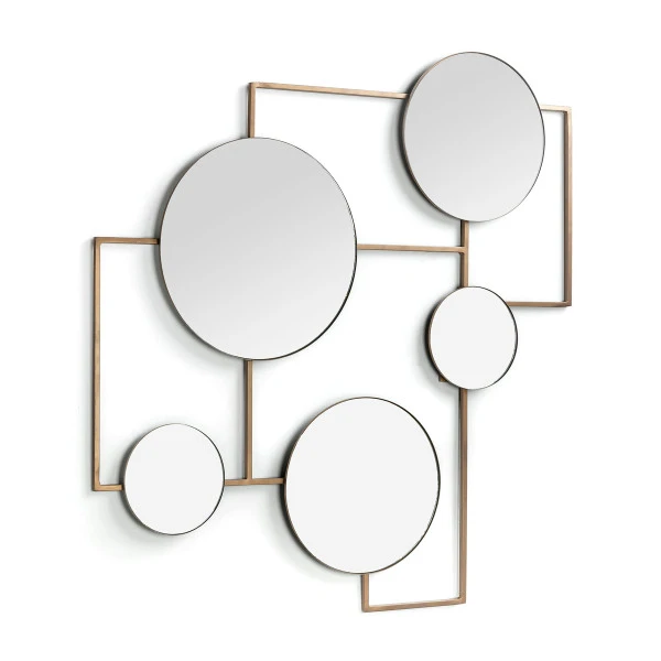 Met deze Kave Home Platte spiegelset tover je die kale wand om tot een interessant en licht geheel! Vijf ronde spiegels in verschillende formaten zijn met elkaar verbonden door een metalen frame in warm goud. De spiegelset heeft een omvang van 81 bij 83 centimeter: een echte blikvanger in je interieur.