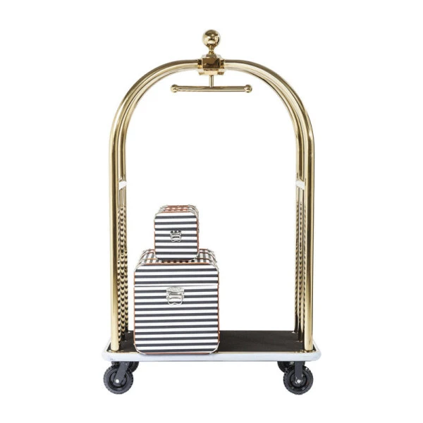 Met de Kare Design Vegas bagage trolley haal je een extravagant element naar je slaapkamer of woonkamer. De trolley is gemaakt van gegalvaniseerd roestvrijstaal en heeft daarom een prachtige, luxe goud tint. Behalve voor kleding kun je de bagage trolley ook gebruiken voor planten en decoraties!
