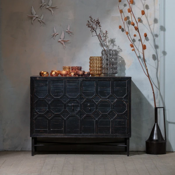 Het BePure Bequest dressoir haal je niet alleen in huis als opbergmeubel: het zwart hout is zo mooi versierd dat je er meteen een bijzondere decoratie bij hebt! De combinatie van roestkleur met een Oosters patroon geeft het dressoir een vintage uitstraling. Origineel, en toch heel subtiel.