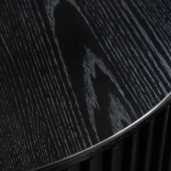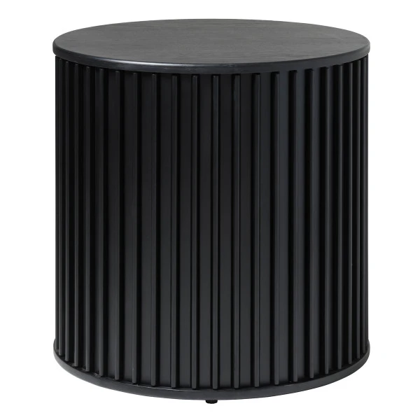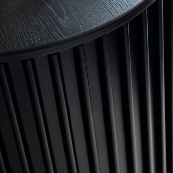 Net als deze ronde bijzettafel zijn de andere meubels uit de serie gemaakt van zwart eikenfineer met een stijlvol en toch speels design. De ronde vormen en stroken hout zorgen voor een retro tintje. Kijk gauw verder voor een bijpassend dressoir of een zwarte wandkast.