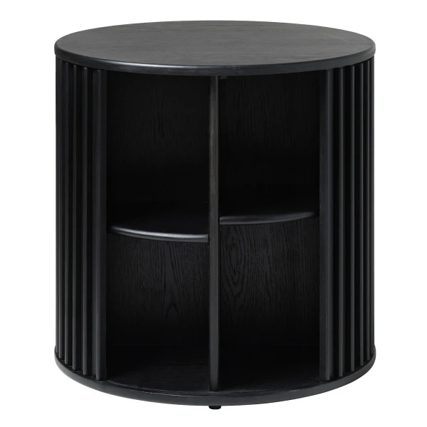 Deze ronde bijzettafel van zwart eikenfineer heeft een geheime opbergruimte. De stroken hout verbergen een schuifdeur, die toegang biedt tot een paar handige opbergvakken. Zo kun je in de bijzettafel mooi een paar onderzetters, wijnglazen of gezellige decoraties kwijt: zet gerust de deur open voor een speels effect! De bijzettafel heeft een rond blad met een diameter van 60 centimeter.