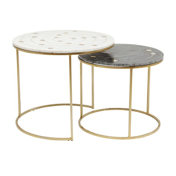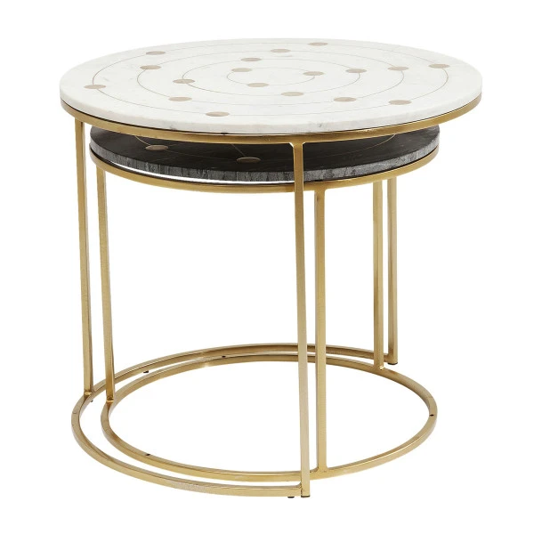 De Kare Design Mystic bijzettafelset straalt je tegemoet met haar mix van messing en marmer. Niet alleen het onderstel is gemaakt van staal met een messing laag; ook in het blad van marmer vind je goudkleurige accenten terug. De tafeltjes hebben verschillende maten, zodat je ze speels bij elkaar kunt zetten. Of verdeel de bijzettafelset juist over de zithoek voor een harmonieus geheel!