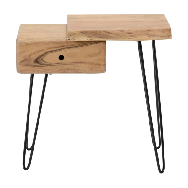 Dit boomstam nachtkastje met houten lade brengt een natuurlijke en rustige sfeer naar je slaapkamer. Ook de lade draagt bij aan een gezonde nachtrust, omdat je losse rommeltjes en je telefoon netjes uit het zicht kunt opruimen! Het acaciahout zit boordevol kleurvariaties en karakteristieke lijnen, die je weer terug ziet komen in het slanke onderstel van metaal: dit nachtkastje is de perfecte mix van sfeer en design.