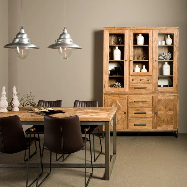 De Tower Living Mascio buffetkast heeft een industriële uitstraling dankzij de mix van gerecycled teakhout en metaal. Een bijzonder detail is het mozaïek in de onderste deuren, dat met de hand is ingelegd! In de vitrine is ruim plaats voor wijnglazen en je mooiste theeservies, terwijl je alledaagse borden en kommen achter de houten deuren kunt opbergen. Onderzetters en theedoeken kunnen in de lades.