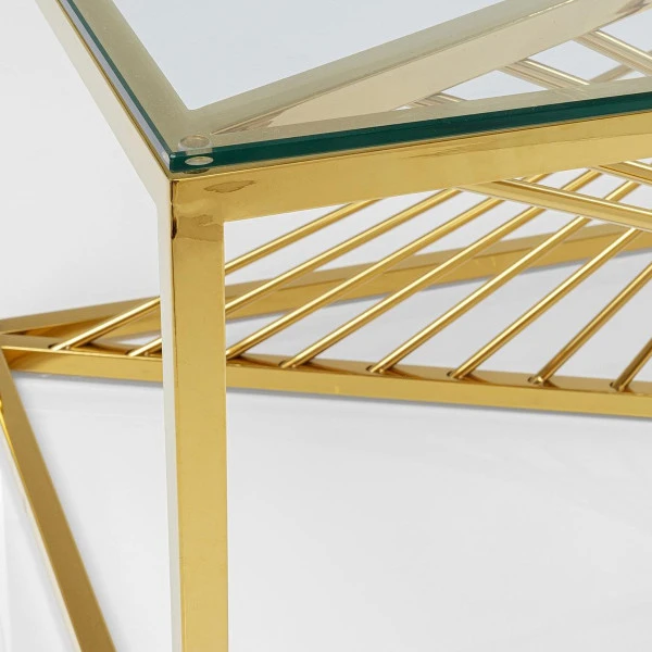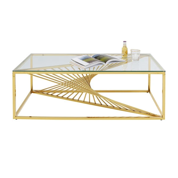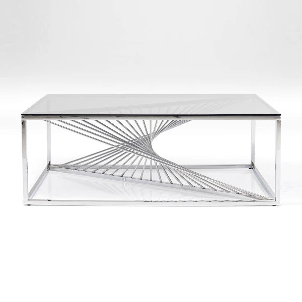 De Kare Design Laser salontafel doet haar naam eer aan: de prachtige kunst onder het blad van glas doet denken aan vergulde of verzilverde laserstralen! Aan jou de keuze, wil je liever een design salontafel in goud of zilver? Beide varianten geven je zithoek veel stijl. Het gouden of zilveren RVS is gepolijst voor extra glans.