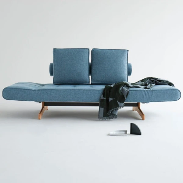 De slaapbank Innovation Living Ghia Wood heeft verstelbare armleuningen zodat je het design naar wens kunt aanpassen: met één leuning omhoog en één naar beneden, of beide plat om er een comfortabel bed van 90 bij 210 centimeter van te maken. Het onderstel van gelakt eiken zorgt voor een elegant en sfeervol geheel. Je hebt bovendien keuze uit enkele standaard stofferingen. Op bestelling zijn echter nog veel meer stoffen mogelijk! Voor deze niet-standaard stoffen geldt een meerprijs en een langere levertijd. Kom gerust langs in de winkel om kleurstalen in het echt te ervaren óf bestel ze voor thuis.