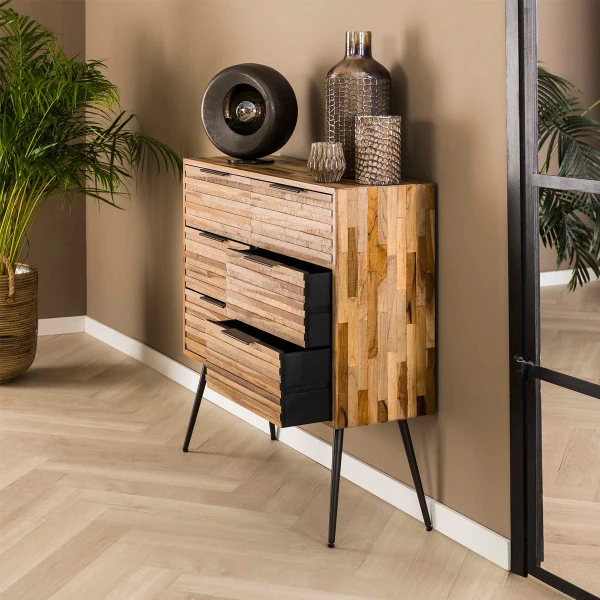 Behalve deze ladekast met 6 lades vind je in de Teca Stripe serie van Giani ook een compact model met 3 lades. Je herkent de meubels uit de serie aan het speelse, eigentijdse design: met stroken ingelegd teakhout en tapse pootjes van metaal. Ook verkrijgbaar als tv-meubel of nachtkastje!