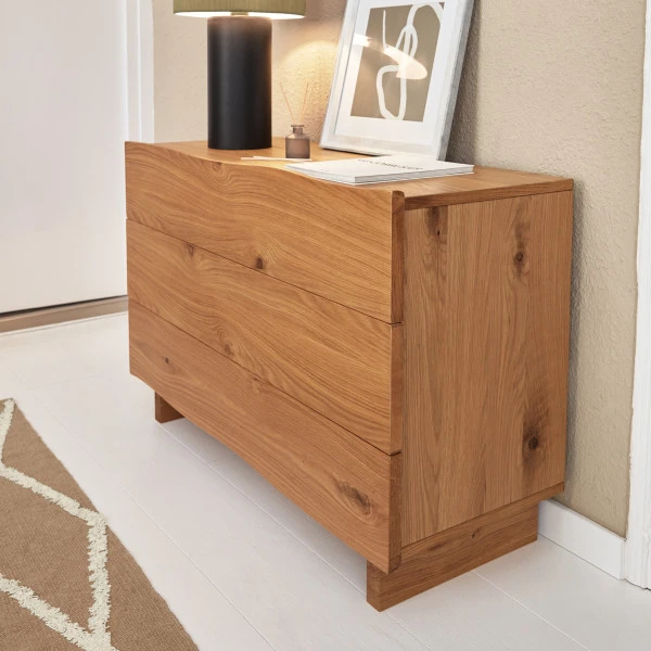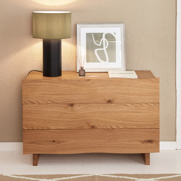 Bijzonder aan de Kave Home Rasha serie is de mix van stoer en stijlvol: strakke lijnen geven de ladekast een moderne uitstraling, terwijl het robuuste boomstam patroon en de brede poten voor een stoer effect zorgen. Kijk gauw verder voor een bijpassend nachtkastje of een eiken dressoir!