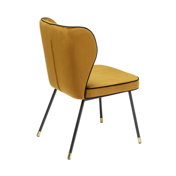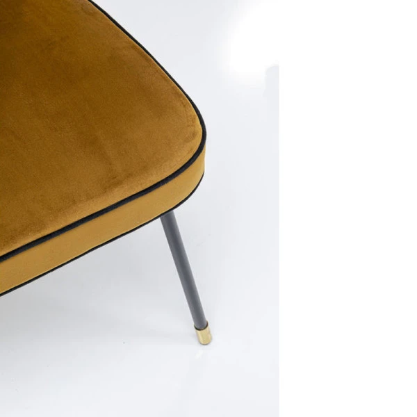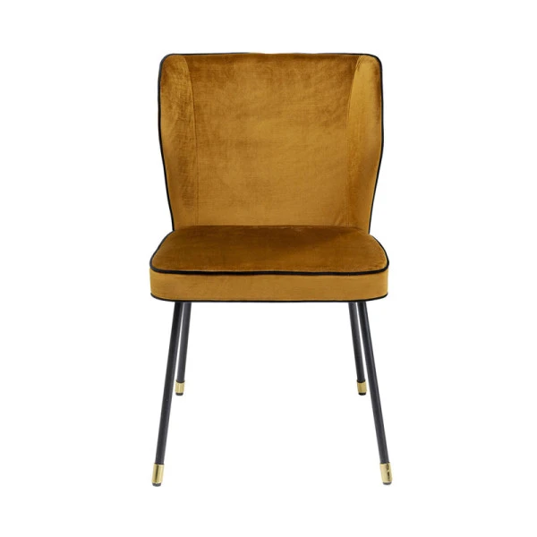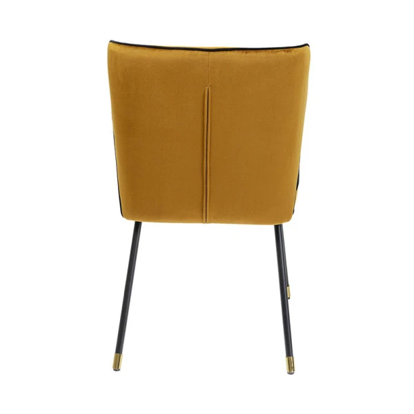 De Kare Design Irina eetkamerstoel combineert een retro design met chique elementen. Want de fluwelen zitting heeft een okergele tint die neigt naar goud; een prachtig geheel met de messing voetjes! Zwarte lijnen in de okergele zitting benadrukken het elegante design van de fluwelen eetkamerstoel.