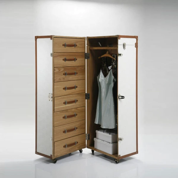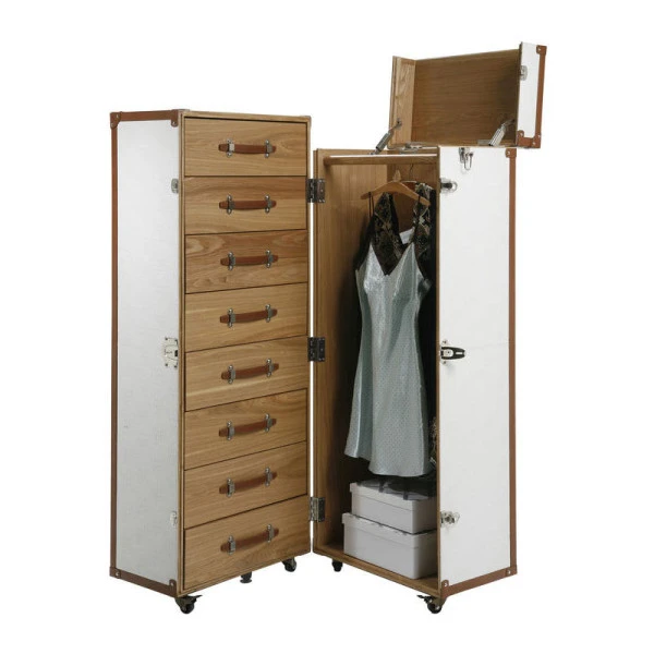 De Kare Design Trunk garderobekast is praktisch en leuk tegelijkertijd. Rol de kastdelen tegen elkaar aan wanneer je klaar bent met omkleden en er blijft een compact meubel over in de vorm van een koffer; ideaal voor in een krappe slaapkamer! Het wit kunstleer heeft een subtiel krokodillenleer patroon, en aan de binnenzijde vind je behalve een roede ook 8 lades en een open vak.
