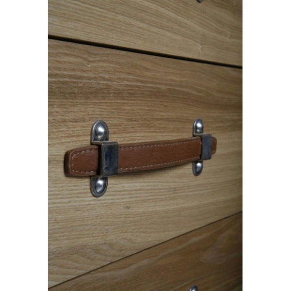 - De voorkant is van kunstleer, MDF, ashout fineer en metaal