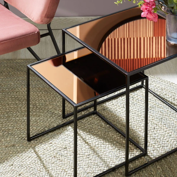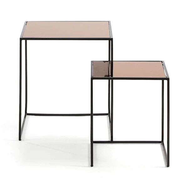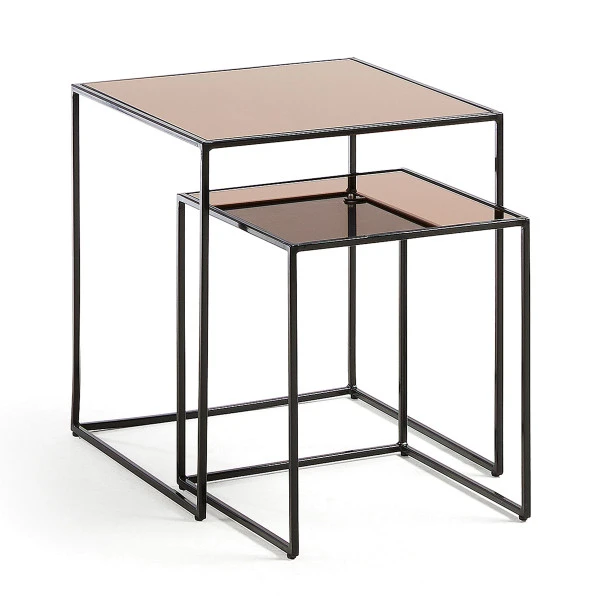 Wat de Kave Home Sute bijzettafelset zo bijzonder maakt zijn de glazen bladen: die hebben een spiegelend karakter en zijn warm goud van kleur! Het onderstel van zwart gelakt metaal vormt de perfecte basis voor deze pareltjes.
