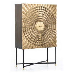 De Eleonora Noa kast is in staat een saaie woonkamer compleet te transformeren. De gouden deuren met reliëf patroon zijn het zonnetje in huis! Slanke, hoge poten geven de kast een ruimtelijk design. Berg er spelletjes in op of zet de gouden kast in de eetkamer en gebruik voor serviesgoed. In de drie ruime vakken achter de deuren kun je heel wat spullen opbergen.