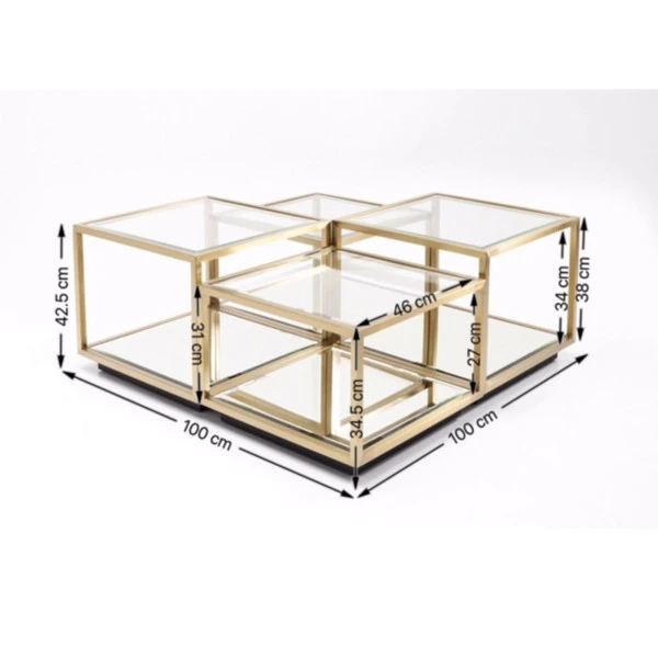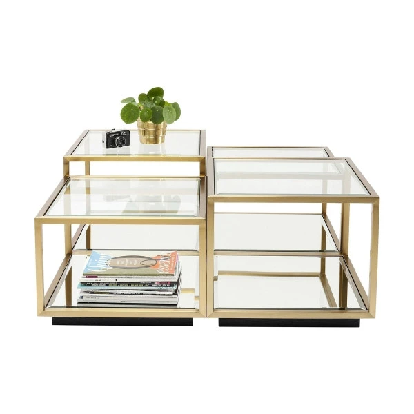 Fijn aan de Kare Design Luigi Gold salontafelset is dat je er eindeloos mee kunt schuiven voor een nieuwe, passende opstelling in de zithoek. De set bestaat namelijk uit 4 salontafels in diverse hoogtes. Samen vormen ze een prachtig gouden geheel, maar je kunt de salontafelset ook verdelen over de zithoek: een tafeltje aan elke kant van de bank, en twee in het midden!