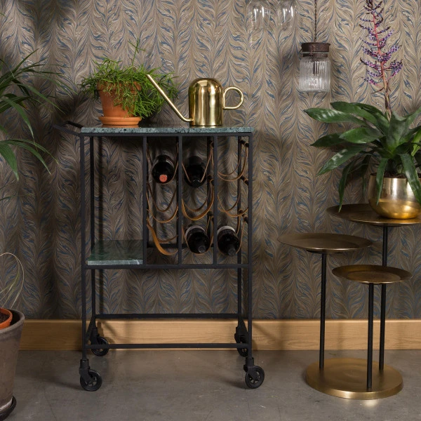 Kenmerkend voor de Dutchbone Mil serie is de chique uitstraling van de kasten, met groen marmeren bladen in een frame van zwart gepoedercoat ijzer. Ben jij een echte wijnliefhebber? Combineer de trolley dan met een groen marmeren wijnkast!