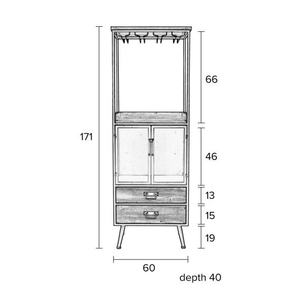 Een hoog wijnkabinet is niet alleen praktisch, maar staat ook heel gezellig in de eetkamer of woonkamer. In dit wijnkabinet hang je de glazen ondersteboven aan het ‘dak’, en is zowel achter de glazen deuren als in het open vak plaats voor wijnflessen of nog meer glazen. Openers en onderzetters berg je netjes weg in de twee lades. Een mooi, hoog wijnkabinet voor in een industrieel of modern interieur!