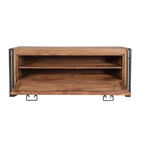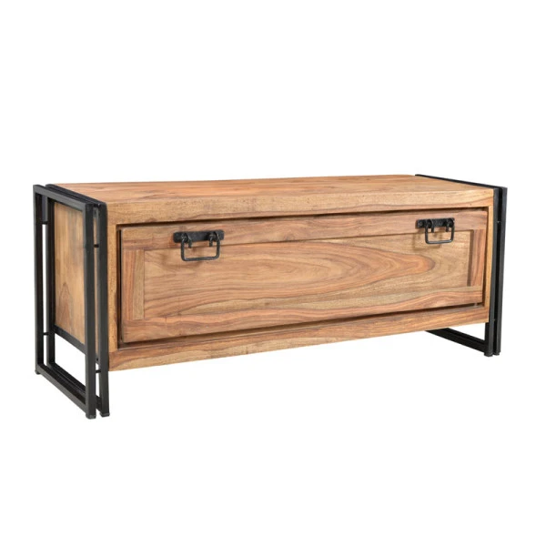 Een houten schoenenkast die in vrijwel elke hal past! Met een diepte van 40 centimeter neemt de lage schoenenkast een bescheiden ruimte in. De mix van sheeshamhout en zwart metaal zorgt voor een industriële look in je hal. Of gebruik de houten schoenenkast in de slaapkamer voor je beste pumps en sandalen! Bovenop het kastje kun je dan een mooie decoratie zetten.