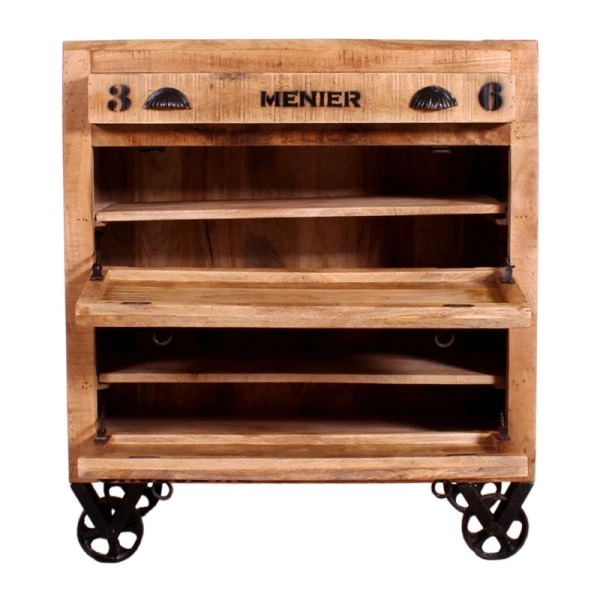 Een industriële schoenenkast op wielen met speelse teksten op het hout. Daar wordt je hal een stuk gezelliger van! Achter de houten deuren vind je vier compartimenten voor sneakers en sandalen. In de lade kun je schoensmeer en de riem van de hond bewaren. Handig aan de industriële schoenenkast zijn de wielen; je rolt de kast zó aan de kant wanneer je gaat stofzuigen.