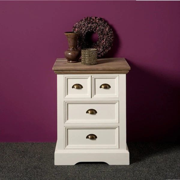 Voor deze Tower Living Fleur ladekast van hout heb je altijd wel een plekje in huis. De ladekast reikt 73 centimeter hoog en kan daarom ook dienen als bijzettafel naast de bank, of gebruik de ladekast als basis voor een mooie groene plant in de hoek van de woonkamer! In de 4 lades kun je post, waxinelichtjes of opladers bewaren. Een landelijke sfeermaker met een functionele kant.
