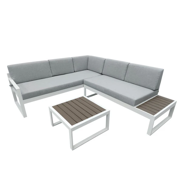 Op deze loungebank kun je met 5 personen genieten van een gezellige barbecue in de tuin! Of ga languit liggen op de kussens en dommel weg in het zonnetje. De loungebank van wit aluminium komt met een bijpassende salontafel, en ook aan een van de zijden is plaats voor hapjes en drankjes. De lichtgrijze kussens vormen een modern geheel met het wit aluminium!