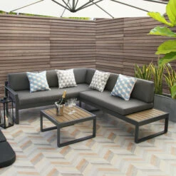 Met deze loungeset in je tuin zit je voortaan elke zomeravond heerlijk buiten. Lekker languit met een boekje, of gezellig met vrienden barbecueën! De loungeset van antraciet aluminium komt met bijpassende salontafel, en ook aan een van de zijden is plaats voor hapjes en drankjes. En dan nóg biedt de loungeset plaats aan 5 personen.