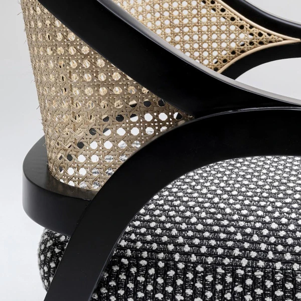 Bijzonder aan de Kare Design Horizon eetkamerstoel is de mix van materialen. Het frame is met de hand gemaakt van zwart gelakt, massief beukenhout. Een rugleuning van rotan webbing zorgt voor sfeer, terwijl de messing voetjes een chique accent brengen! Het gezellige zitkussen maakt de retro eetkamerstoel helemaal af.