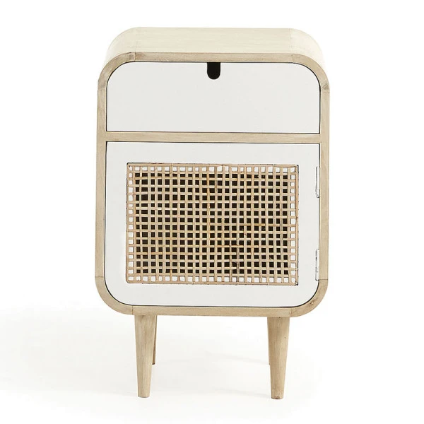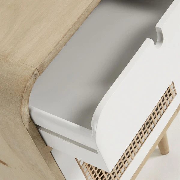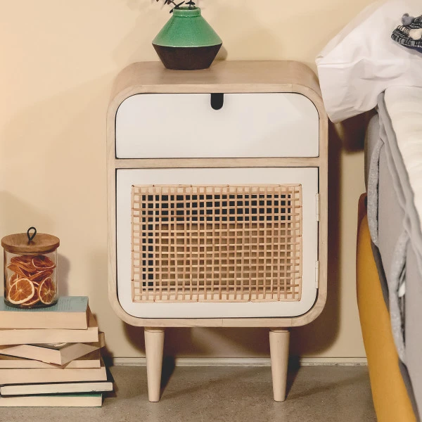 Met dit Kave Home Georg nachtkastje van 40×60 centimeter naast het bed krijgt je slaapkamer een gezellige uitstraling. Het mango houten frame zorgt voor sfeer, maar heeft dankzij de strakke lijnen en afgeronde hoeken ook een rustig effect op je slaapomgeving. Berg crèmes, oordopjes en je telefoon netjes weg in de lade van het nachtkastje; voor een leesboek en tijdschriften is plaats achter de rieten deur.