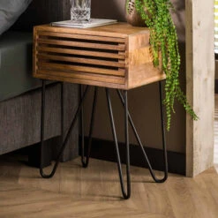 Dit mangohouten nachtkastje heeft een modern design met een industrieel tintje. De metalen poten vormen speelse lijnen die perfect samengaan met de stroken mangohout in de lade. Bovenop het nachtkastje is plaats voor een leeslamp of plantje; in de lade kun je een boek, oordopjes, nachtcrème en telefoon opbergen. Dit mangohouten nachtkastje past aan beide kanten van het bed.