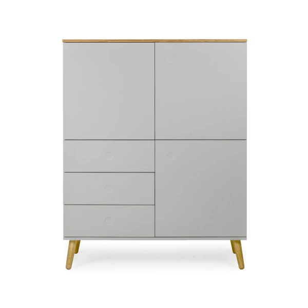 De meubels in de Tenzo Dot serie zijn verkrijgbaar in verschillende kleuren. Zo heb je bij deze wandkast keuze uit een mix van eiken met wit, grijs of groen: welke is jouw favoriet? Het minimalistische design zie je ook terug in de bijpassende tv-meubels en ladekasten uit de serie.