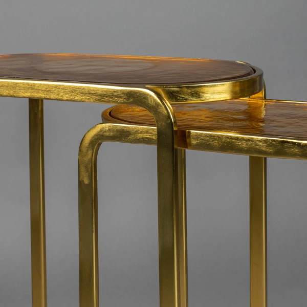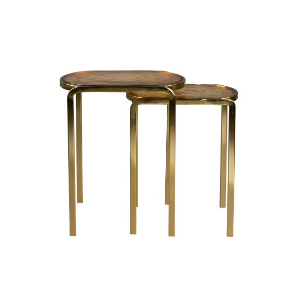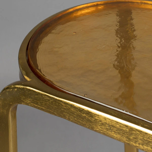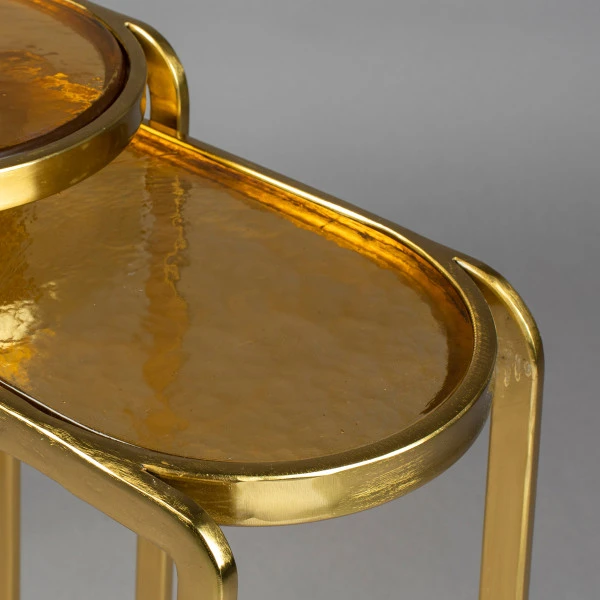 Bijzonder aan de Dutchbone Bandhu bijzettafelset is de mix van messing en amber gekleurd glas. Samen vormen ze een warm en chique geheel! Het messing frame is bovendien voorzien van een antieklook. Combineer de bijzettafelset met een bruin leren bankstel om de warme tinten van het messing en amber gekleurd glas extra mooi uit te laten komen.