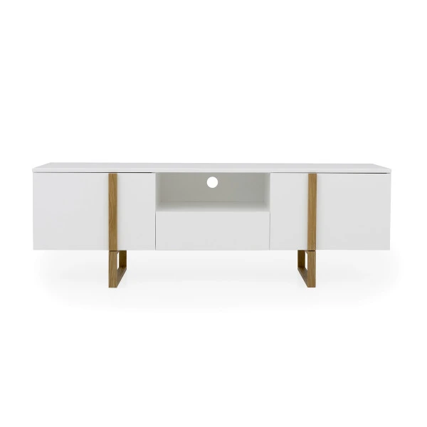 Kenmerkend voor de Tenzo Birka serie is de band van eiken, die het strakke geheel een speelse uitstraling geeft. Behalve dit tv-meubel vind je in de serie ook een modern dressoir en een bijpassende eettafel met eiken poten.