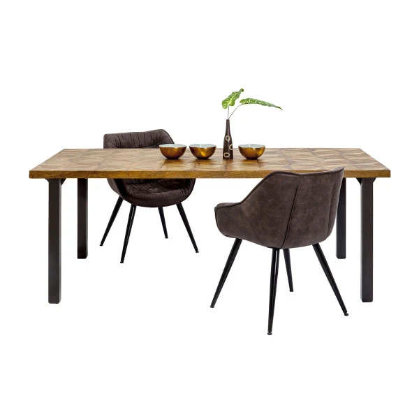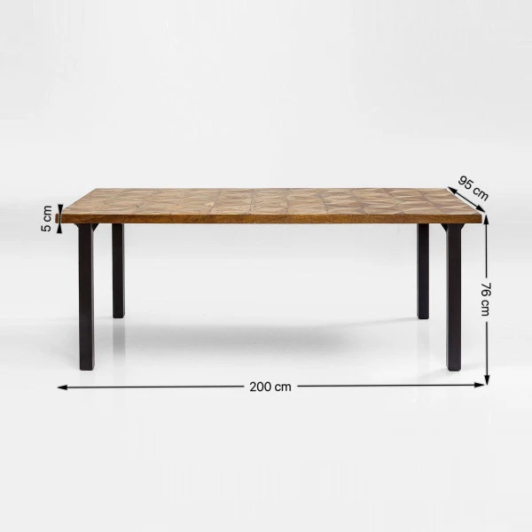 De Kare Design Illusion Gold eettafel heeft een mozaïek patroon dat zó bijzonder is, dat je er eigenlijk geen pannen en borden op wil zetten! Toch blijft er ook dan genoeg om naar te kijken. De eettafel biedt met een breedte van 200 centimeter heel wat ruimte voor lekkere maaltijden, waar je samen met vrienden of familie van kunt genieten. Dankzij de mix van hout en staal heeft de eettafel een stoere uitstraling.