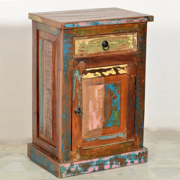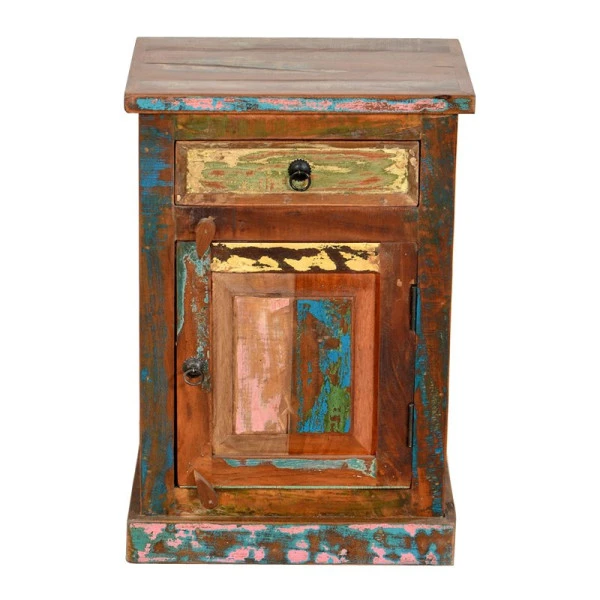 Naast dit nachtkastje van Indiaas sloophout kun je niet anders dan heerlijk dromen over verre reizen en warme landen. De planken van oude vissersboten zijn met de hand bewerkt tot een gezellig nachtkastje, dat de vrolijke kleuren van het verre India nog steeds draagt. Elk exemplaar is uniek, met een eigen verhaal en karakter.