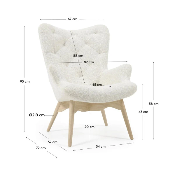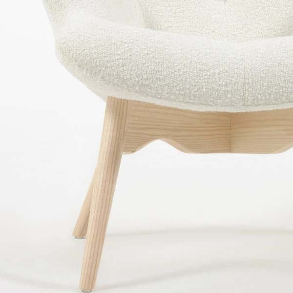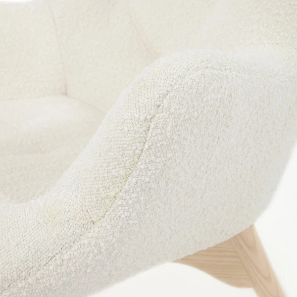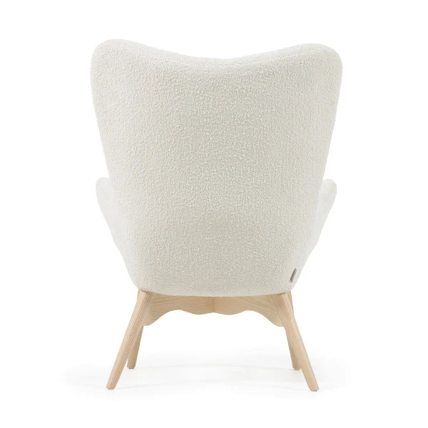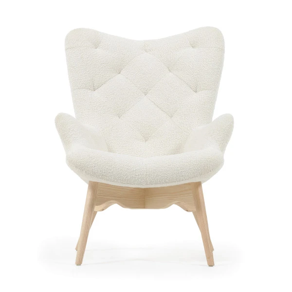Zet de Kave Home Kody vlinderfauteuil in de zithoek of geef de stoel een eigen plekje bij het raam. Dankzij de combinatie van wit bouclé en naturel beukenhout past de vlinderfauteuil heel mooi in een Scandinavisch design interieur. Of combineer met een retro woonstijl!