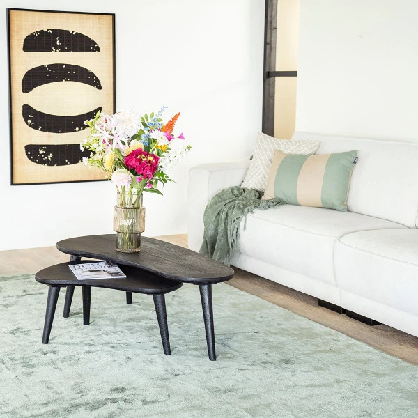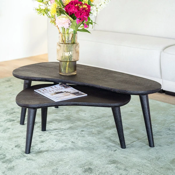 Met de By-Boo Guus salontafel set creëer je een speels effect in de zithoek. Elke salontafel heeft een sierlijke, organische vorm. Zet ze gezellig naast elkaar voor extra veel tafelruimte, of schuif de kleine salontafel deels onder de grote en plaats daar een mooie decoratie op! Het mangohout is zwart afgelakt, waardoor het samen gaat met vrijwel elke kleur bank of vloerkleed.