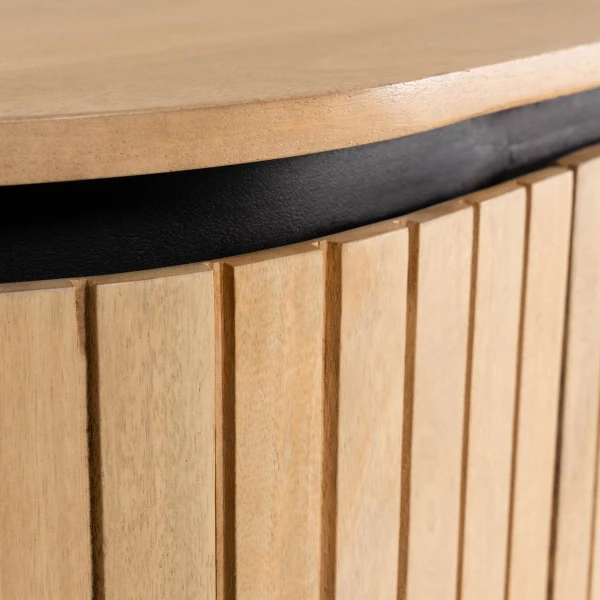 Het ovaal Kave Home Licia dressoir bestaat uit tientallen stroken mangohout, die met de hand zijn afgewerkt voor een verfijnd resultaat. Een beschermende lak houdt het dressoir lang mooi. De deurenopeningen zijn subtiel verborgen tussen de stroken van mangohout: je verwacht niet dat het dressoir zóveel handige opbergruimtes te bieden heeft! Gebruik voor serviesgoed, administratie, fotoalbums of losse rommel.