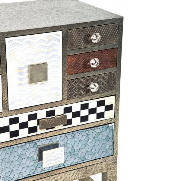 Het Kare Design Chalet 14 dressoir heeft zoveel kleur en karakter dat je er naar blÃjft kijken! De 14 lades zijn voorzien van uiteenlopende patronen en design handgrepen die voor een retro look zorgen. Ook de vintage afwerking van de metalen ombouw draagt bij aan het jaren ‘50 geheel. En met zoveel lades in één dressoir heb je voortaan voor elk type rommeltje een vaste opbergplaats!