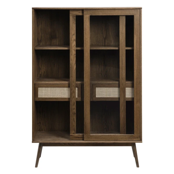 Een compacte wandkast met een retro uitstraling. De wandkast van 110 bij 160 centimeter neemt een bescheiden plaats in, maar zorgt wel voor veel sfeer! Bovendien kun je er heel wat serviesgoed, boeken of souvenirs in kwijt. Leuk detail: achter de glazen deuren zie je twee houten lades met rotan frontjes. Wat betreft het hout heb je keuze uit twee kleuren: naturel of walnoot.