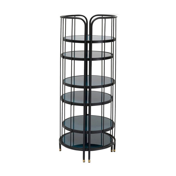Natuurlijk hoef je de ronde Kare Design Bandeja stellingkast niet in de keuken te zetten: ook in de woonkamer komt deze van pas. Het design voegt bovendien veel stijl toe! Een mix van zwart gepoedercoat metaal, donkerblauw gecoat glas en messing zorgt voor een luxe geheel. Elke stellingkast is met de hand gemaakt.