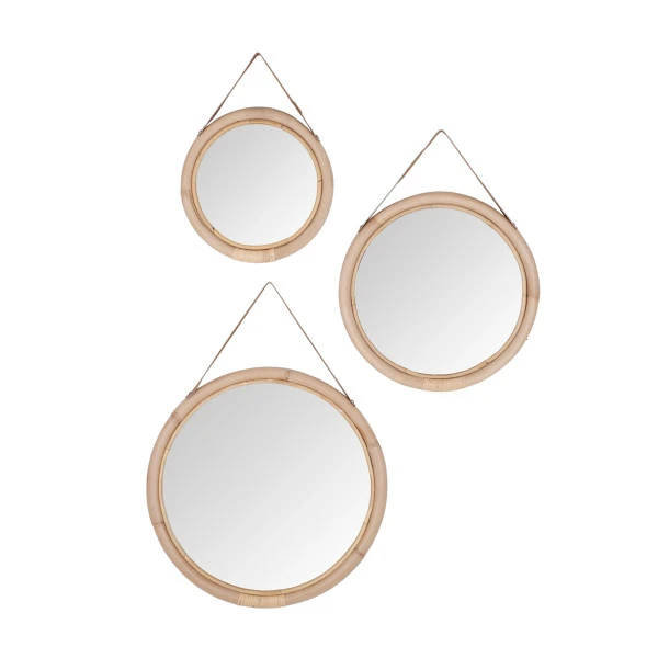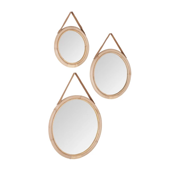 Met de Must Living San Jose spiegels van rotan haal je een natuurlijke sfeer in huis. De set bestaat uit 3 ronde spiegels van onbewerkt, gebogen rotan aan een bruine lederen hanger. Hang ze gezellig bij elkaar of verdeel de set van spiegels over de woonruimte! De 3 spiegels hebben een verschillend formaat zodat ze samen een speels geheel vormen. Leuk boven een rotan dressoir of fauteuil.