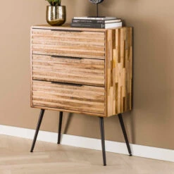 Dit ladekastje heeft een speels karakter en vormt zo een gezellige noot in je interieur. Het ladekastje is ingelegd met stroken teakhout met een warme en natuurlijke uitstraling. Een echte sfeermaker! Met een formaat van 60 bij 80 centimeter is het ladekastje lekker compact: ideaal voor die paar losse rommeltjes in de woonkamer. Of gebruik de 3 lades voor boeken en tijdschriften.
