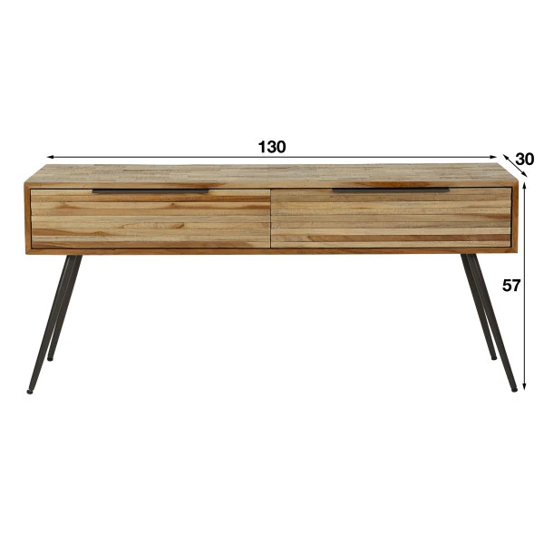 Een speels tv-meubel dat je zithoek erg gezellig maakt. Het teakhout brengt een natuurlijke sfeer en zorgt voor het speelse effect, doordat het hout in strookjes is ingelegd. Ook de tapse poten van metaal dragen bij aan het eigentijdse karakter van het tv-meubel. Hang een flink beeldscherm boven het meubel en zet je apparatuur op het kastje; in de lades is plaats voor losse rommeltjes!