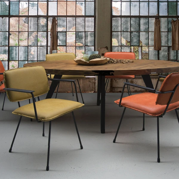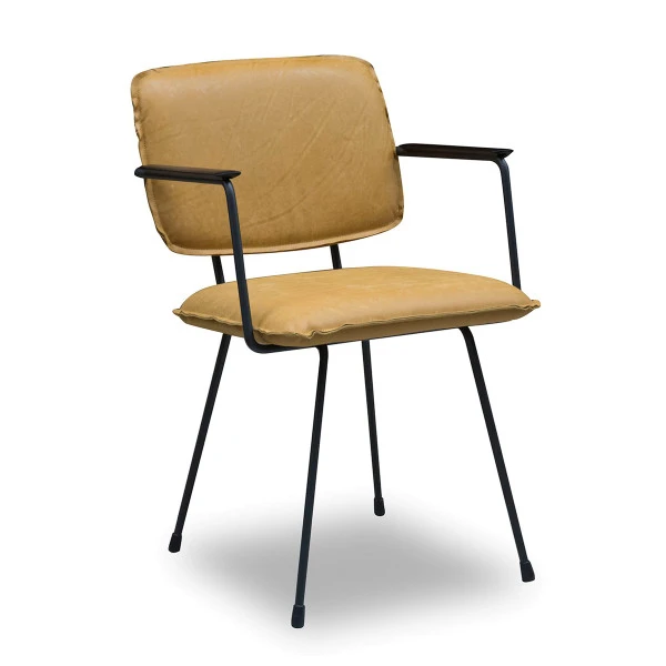- Afgebeeld: Africa Leder Mustard (Leergroep S) met zwart frame, open naad en bakeliet armleuningen