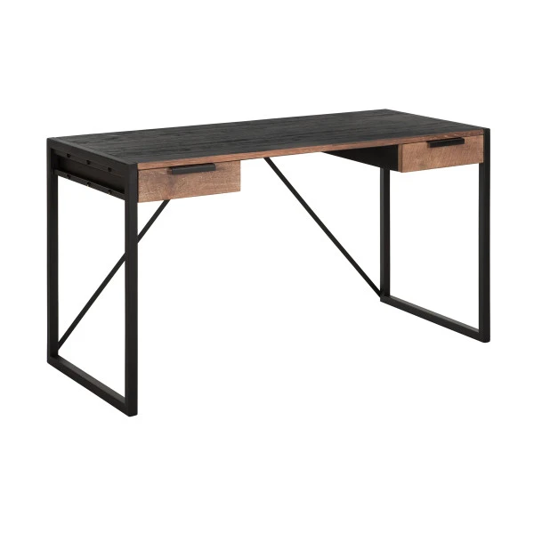 - Industrieel bureau met strakke lijnen en een mix van zwart en natuurlijke bruintinten