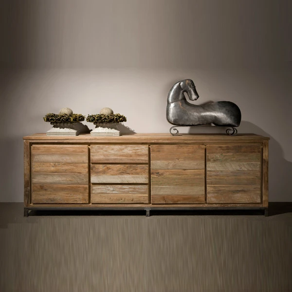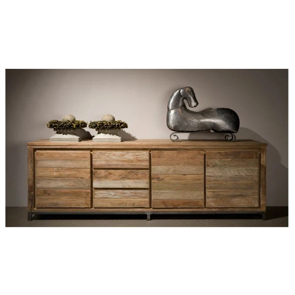Een riant dressoir van 220 cm breed dat je kamer een natuurlijke sfeer geeft. In het robuust afgewerkte teakhout zie je de karakteristieke lijnen van het hout mooi terug. Natuurproducten zijn nooit hetzelfde en omdat hier gebruik is gemaakt van gerecycled hout heeft elk dressoir een extra uniek karakter met een eigen verhaal!