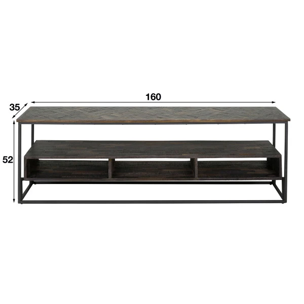 Dit teakhouten tv-meubel maakt je zithoek gezellig en stijlvol. Het bovenste blad is ingelegd met een prachtig Versailles houtpatroon, maar ook het houten vak eronder brengt veel sfeer. Daar kun je apparatuur in zetten, of leg er stapels met boeken in. Voor decoraties is dan nog ruim plaats op de planken. Met een breedte van 160 centimeter past er een flink beeldscherm op of boven het tv-meubel.