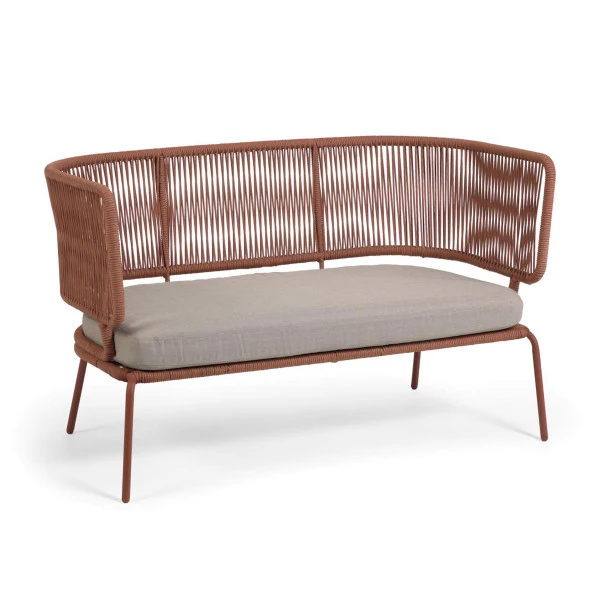 Met de Kave Home Nadin tuinbank tegen de gevel van je huis kun je heerlijk genieten van het voorjaarszonnetje! Of drink ijskoude limonade in de zomer en droom weg op de zachte kussens. Dankzij het moderne design brengt de tuinbank bovendien een trendy look naar je terras. De handgewoven zitting en rugleuning zijn verkrijgbaar in oranje of groen touw; welke tuinbank vind jij het mooiste?