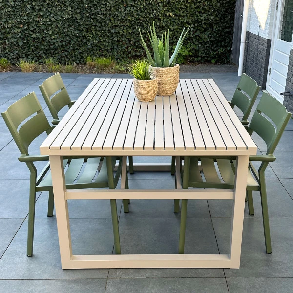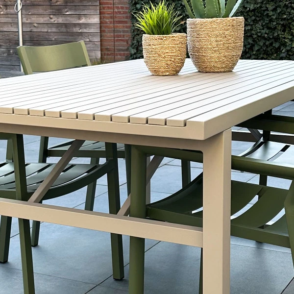 Deze tuintafel van aluminium is verkrijgbaar in verschillende varianten, zodat je altijd een match vind met jouw terras. Kies uit drie kleuren: kaki, wit of zwart. En bepaal vervolgens hoe breed jouw tuintafel mag zijn: 160 of 230 centimeter. Wil je met een heel gezelschap van vrienden aan je tuintafel spelletjes doen, of gebruik je de tafel om ’s avonds buiten te eten met het gezin?