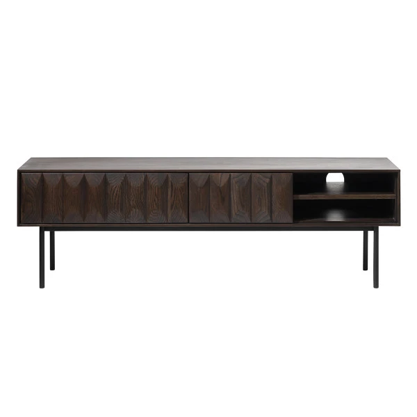 Deze tv kast van donkerbruin eikenfineer heeft een vintage uitstraling. Dat komt door de combinatie van de warme espresso kleur, het reliëf in de lades, en de slanke poten van metaal. In de open vakken kun je apparatuur kwijt; post en laders berg je netjes weg in de lades. Met een breedte van 160 centimeter past er een mooi beeldscherm op of boven de tv kast.
