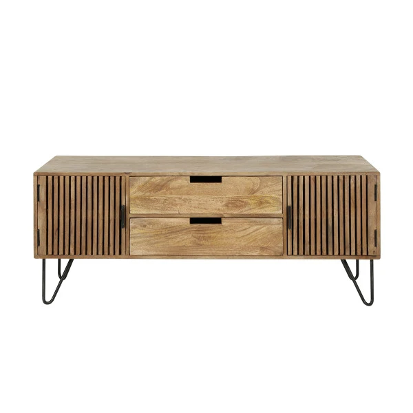 Wat dit tv-meubel van mangohout zo bijzonder maakt zijn natuurlijk de ribbel deuren. Maar ook de slanke poten van metaal geven het stoere tv-meubel een design tintje! Met een breedte van 135 centimeter, twee deuren en twee lades biedt het tv-meubel volop ruimte voor al die losse rommeltjes die anders de woonkamer zo ongezellig maken. Apparatuur past natuurlijk ook in de kast!